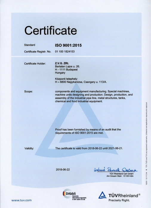 ZVG Zrt. Operates and develops an integrated quality management system according to the MSZEN 9001-2015 standard.